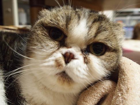折れ耳スコ。折れ耳同士を交配したためか、6か月を過ぎた頃より四肢異常出現。不自由な体でも懸命に生きているてんちゃん。シニアステージに入っても威厳を保ってがんばっている。てんちゃんの体の事、毎日をゆるゆるっと記録していくよ~~。