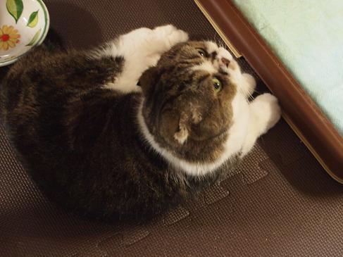 よいしょよいしょとマットの上を歩いて、足置きの角でスリスリして、